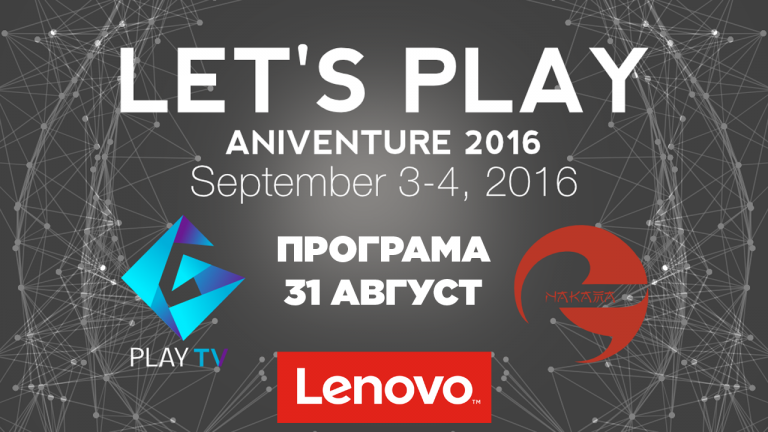 Гледай на живо стриймовете от Let's Play @ Aniventure! Main Stage - gplaytv1 StarCraft II -gplaytv2 Главна сцена - Събота 11:00 Откриваща церемония GplayTV 11:30 Първи CS:GO полуфинал Bo3 BPro...